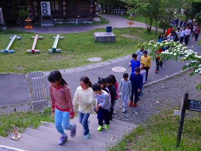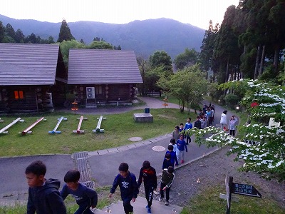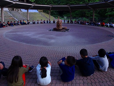 最後の夜。キャンプファイヤーが始まりました。まずは,入場。静かに静かに5年生の子どもたちが集まります。