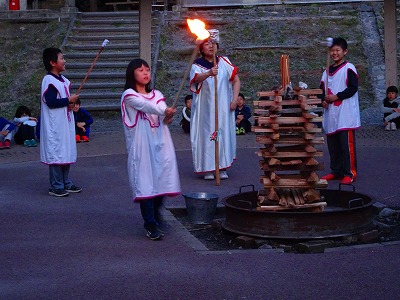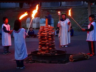 火の女神の入場です。友情・協力・感謝の火をもらい,火の子たちが3つの火をともします。