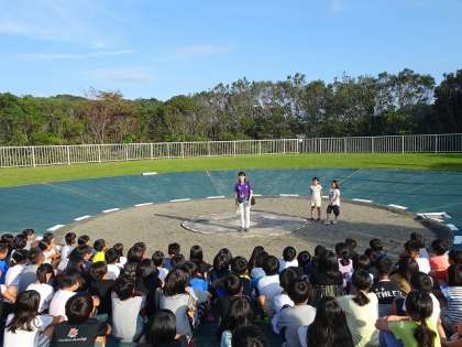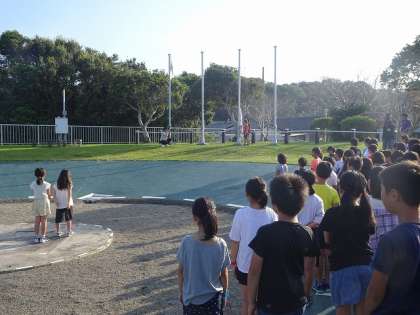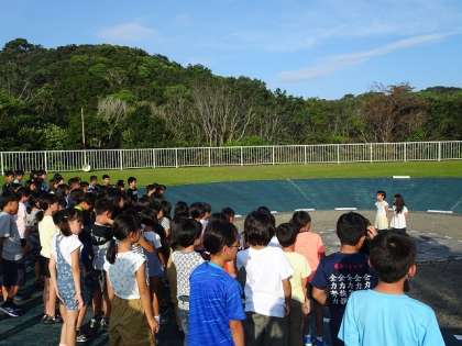 3日目の朝のつどいです。2日間,たっぷり活動した子どもたちはまだ少し,眠たそうでしたが全員元気です。青空の中で気持ちの良いスタートを切りました。