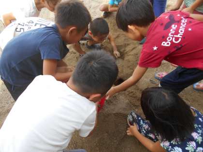 泥だんごを作ったり,地面に絵をかいたり,飛ばしっこ競争をしたり…子どもたちは,とんだりはねたりしながら,全身を使って生き生きと活動していました。