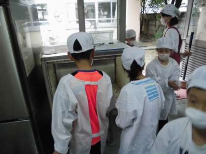 今日の給食は,麦ごはん・牛乳・和風カレーどうふ・ほうれん草ともやしのごま煮でした。カレー粉のよい香りと,豚肉や野菜のうま味が合わさり,ごはんがすすみました。給食室の展示食(写真:左)は,中学年の量です。低学年はこの展示食よりも少なく,高学年は多く盛り付けて食べています。給食室で量や盛り付ける食器を確認し(写真:右),さらに教室で給食カレンダーを見てから食べます。今日の給食もおいしかったですね!
