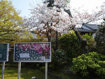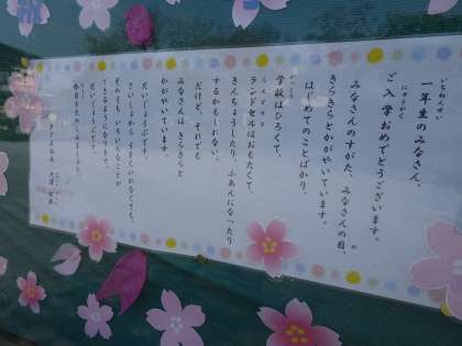 正門をくぐったところにPTAの掲示板があります。入学・進級をお祝いして,きれいな桜の飾りが作られていました。素敵なお祝いの言葉もあります。学校に来られた際に,見ていただけると嬉しいです。
