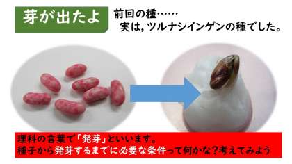 1〜4年生でも植物を育てたよね。その時のことを思い出して,「〇〇の時は芽が出なかった」や「△△の時はたくさんの芽が出た。」などをもとに考えてみてください。