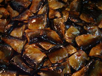にしんを配缶した後の煮汁を使って, なすを煮付けます。にしんの小骨などが残っているので, 煮汁は一度こしてから使います。