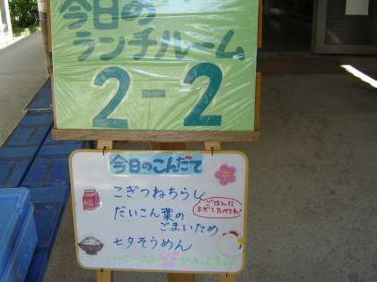 「こぎつねちらし・だいこんばのごまいため・たなばたそうめん」です。たなばたそうめんは, 天の川に見たてたそうめんと, 星に見たてたおくらを入れます。