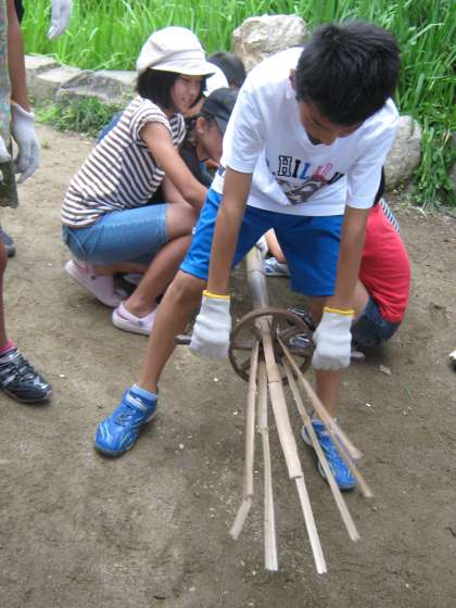 まずはじめに一本の竹をたてに割ります。みんなで声をかけ,心をひとつにして竹割り器をつかって竹を8本に裂きました。