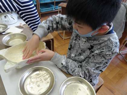 4年生は図工展に向けて,「嵯峨面」を作っています。