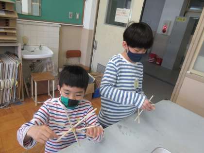 「どれだけのわりばしをつなぐことができるかな。」輪ゴムとわりばしでどんどんつないでいます。縦に長く繋いだり,横に広く繋いでいったりと,楽しそうに学習しています。次は,繋いだものに飾り付けをしていきます。