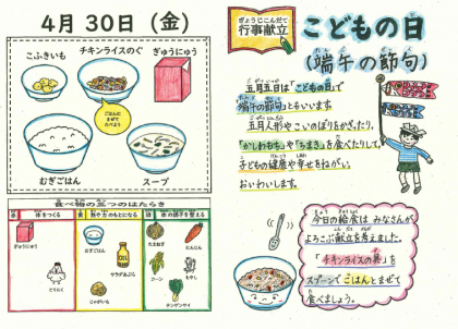 4月30日の給食は,「こどもの日」献立でした。こどもの日の5月5日を「端午の節句」と呼びます。こどもたちの成長を願い,こいのぼりを飾ったり,かしわもちやちまきを食べたりします。給食では,こどもたちが好きなケチャップ味の「チキンライス」とホクホクしたじゃがいもの「こふきいも」,「スープ」でお祝いしました。
