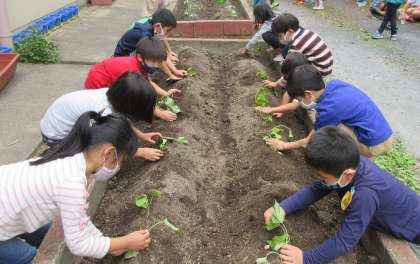 たくさん大きく育つようにていねいに植えて,みんなで水やりをしています。