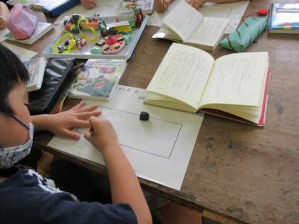 図画工作では,読書しおりを作っています。自分が読んでおもしろかった本,感動した本,おすすめしたい本など選んでいます。自分が選んだ本で,しおりとしてのせたい場面を描いています。