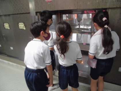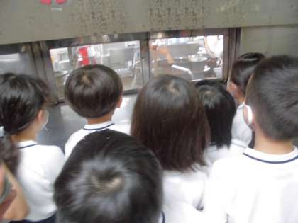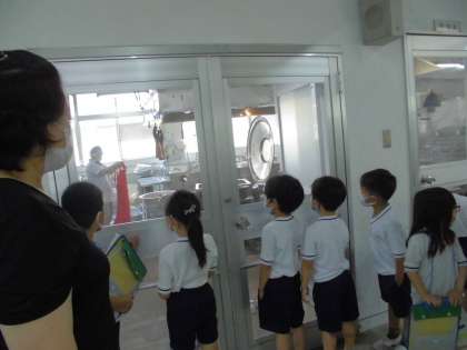 1年生が学校探検で給食室にも来てくれました。初めて給食を作っている様子を見た1年生は,「あんなに大きな釜で作っているのか〜。」,「早く今日の給食が食べたい!」,「マスクをしていても良い香りがする!」と嬉しそうでした。