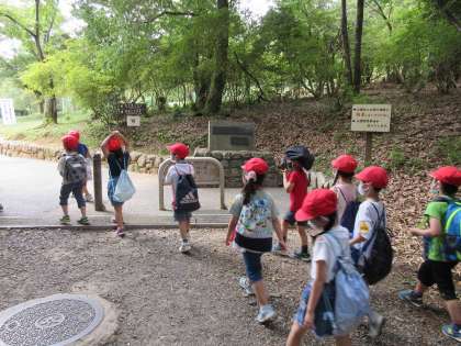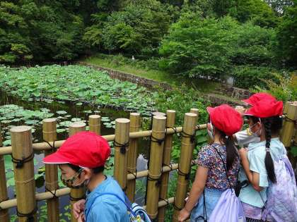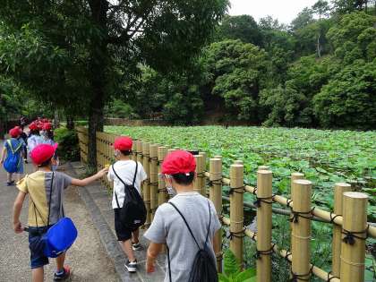 晴れた暑い日でしたが,小倉池のハスを見ながら,涼しい木陰を歩き,亀山公園へ向かいます。