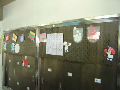 今, 子どもたちは, 暑い中運動会の練習をがんばっています。私たち調理員も, 子どもたちに「運動会の練習がんばってるなあ!」「暑さに負けないでね!」など, 声かけをするようにしています。また, がんばっている子どもたちを, 少しでも応援したいという思いから, 運動会の飾りや, メッセージを貼っています。嵯峨小学校の給食室のマスコットキャラクター, ハッピーキャロットも, サービスホールの入り口で子どもたちを応援しています。