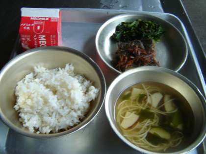 今日の給食は, 牛乳, 麦ご飯, さばのしょうが煮, ほうれんそうのおかか煮, すまし汁です。