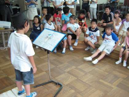 <はかせ>たちは,先生手作りの博士帽をかぶらせてもらい,<はかせかあど>をもとにして発表をします。