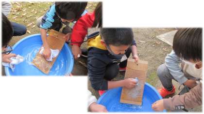社会科でくらしのうつりかわりの学習をしています。とても便利な今を生きている子どもたちにとって,昔のくらしとはどのように感じるのでしょうか。今では洗濯機で簡単にできる洗濯に洗濯板を使ってチャレンジです。「寒くてもしなあかんのやなぁ。」「洗濯機,とっても便利なんやなぁ。」「昔の人って大変やったんやなぁ。」がんばって雑巾を洗濯しました。