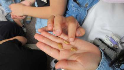 理科の学習で,ツルレイシを育てます。今回はタネを観察し,植えました。これまでに植えたことのあるアサガオやオクラなどのタネと形・色が全然違いました。どんな芽が出るのかなと楽しみに植えました。