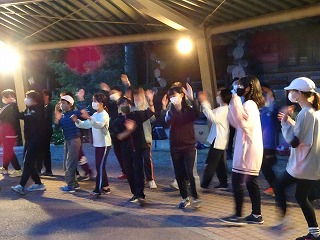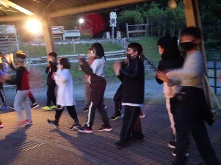 キャンプファイヤーの最後の締めくくりは,「こきりこ」です。音楽の時間に練習したそうです。音楽に合わせてゆっくり踊っていると,周りもすっかり暗くなり,花背山の家に夜がやってきました。