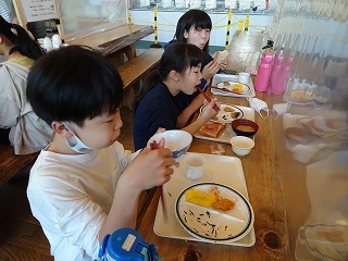 朝ごはんの時間です。ご飯の後は,アスレチックが待っています。しっかり食べてたくさん体を動かそう!