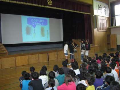 朝会の後は,元気委員会からの歯の健康についての話,続いて「にじ」の歌を全校合唱しました。