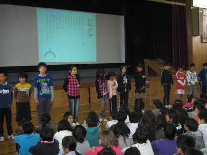 最近,朝夕が寒くなり体調を崩す児童も出てきているので,学校長より,「健康に気をつけてしっかり学習するように」という話がありました。また,先日の学芸会のがんばりを,保護者や地域の方々が賞賛されていたことも話されました。