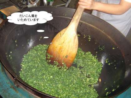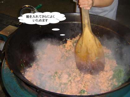さけとだいこん葉のまぜごはんを作っているところです。だいこん葉をよくいため, さらに鮭を入れてよくいためます。だいこん葉と鮭がきれいに混ざるように心がけています。