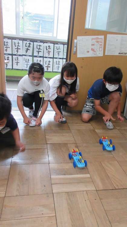 理科『電池のはたらき』の学習も終わり,お楽しみの電池を使った車を作りました。モーターで直接車輪が動くようにしたり,プロペラにつなげて動くようにしたり,動く車を作りました。作った後はみんなで走らせました。