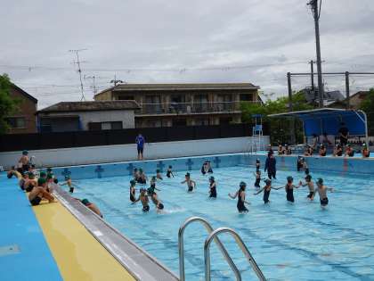 小学校の大きなプールは初めてでドキドキしているようでしたが,水につかると「わー!」「冷たいー!」と楽しそうな歓声が上がりました。