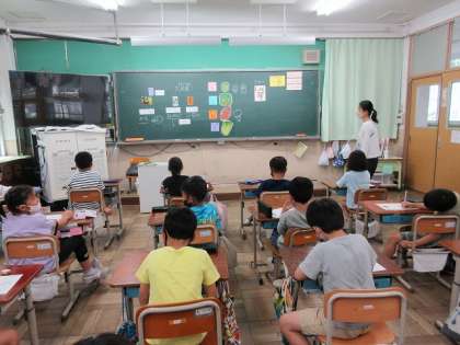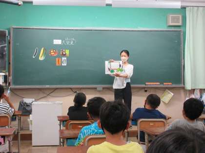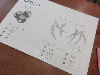 栄養教諭の小林先生から「旬の食べ物」について学習しました。京野菜の賀茂茄子やまんがんじ唐辛子を実際にみて,「こんなに大きいナスがあるの〜?」や「おおきいししとうや〜」と,感想を言っていました。