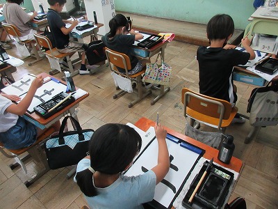 「あ〜、ちょっと長すぎた!」「線が細くなりすぎた!」など、いろいろな声が聞こえましたが、失敗を次に生かしながら、一画一画丁寧に、集中して書くことができました。