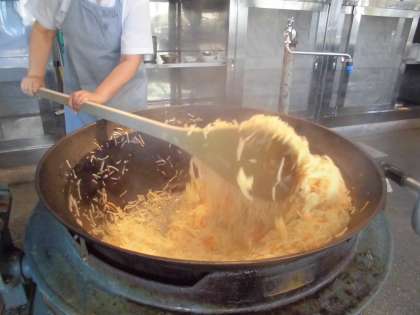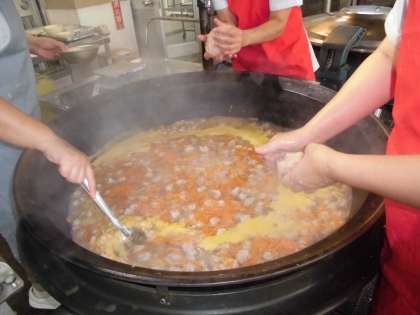 9月26日(月)の献立は「ごはん・肉だんごのスープ煮・じゃがいものピリカラいため」でした。「肉だんごのスープ煮」は、給食室で肉だんごの生地を練り、釜に入れていく際、たくさん食べられるようサイズも小ぶりにし、さらに野菜もたっぷり入れたスープ煮に仕上げました。「じゃがいものピリカラいため」は、じゃがいもを歯ごたえが残る程度にさっとゆでて、にんじんとともにいため、みりん・トウバンジャン・塩・うすくちしょうゆ・米酢で味付けして仕上げました。
