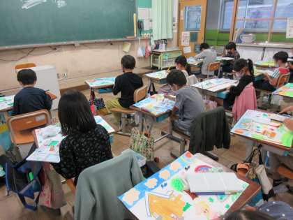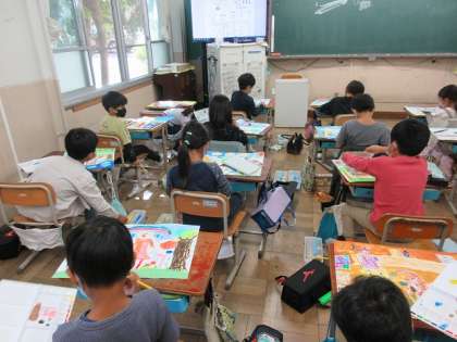図画工作で取り組んでいた,「お話しの絵」がついに完成しました。お話しから想像を膨らませて,絵の具やクレパスを使ってカラフルに仕上げました。