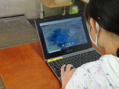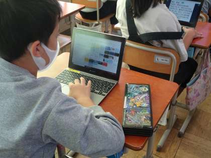 先週、取り組んだ「水から発見!ここきれい!」の学習で撮影した写真の鑑賞を行いました。友だちの作品を見ながら「この色がすごくきれい!」「寒色と暖色の組合せがいい!」と感想を伝え合うことができました。写真の撮り方で作品の様子が変わる面白さにも気付いていました。