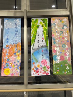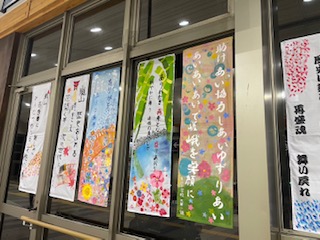 先日行われた嵯峨中パレードに向けて、クラスごとに作成した力作ののぼりがJR嵯峨嵐山駅に掲示されています。期間は、10月11日(火)〜10月31日(月)です。JR嵯峨嵐山駅2Fの自由通路付近にて設置されていますので、お時間があればぜひ見に行って下さい。