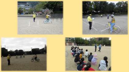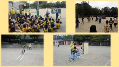 自転車運転免許講習会をしました。右京警察署の方や,嵯峨交通安全推進会の方々に来ていただき,自転車の乗り方や特に気を付けなければならないところなどを学びました。