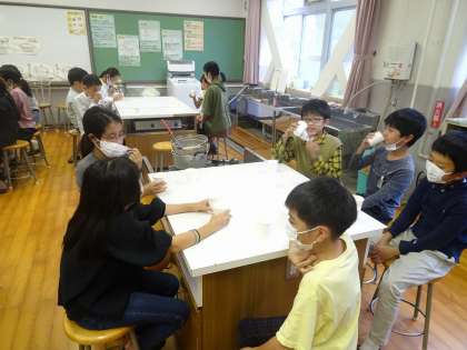出汁の取り方、出汁のうま味、出汁の種類などを教えてもらいました。特に五味の一つである「うま味」は日本人が発見したと聞いてみんな驚いていました。世界でも「UMAMI」で通用するそうです。出汁ってすごいですね。来週の調理実習では、にぼしの出汁を使ってみそ汁を作ります。