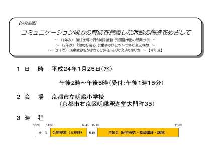 さて,本校では下記の通り,「英語活動・外国語活動授業実践研究発表会」を開催いたします。新学習指導要領実施に伴い,5・6年生における「外国語活動」が本格実施となりましたが,本校ではその目標を達成するためにどのような取組を進めていけばよいのか,授業実践を核として研究してまいりました。