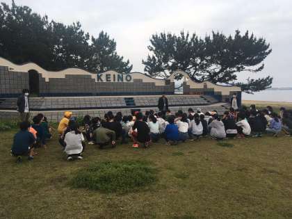 海辺で朝のヒーローの集いを行なっています。みんな元気に2日目の朝を迎えました。
