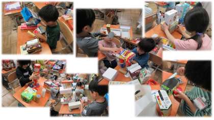 図工『はこで つくったよ』の学習では、算数の学習で使った箱を使って、いろいろなものを作りました。「キリンを作るで!」「自動車を作ってる!」「大きなお城!!」と箱の形をいかして楽しんで作品を作り上げました。