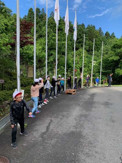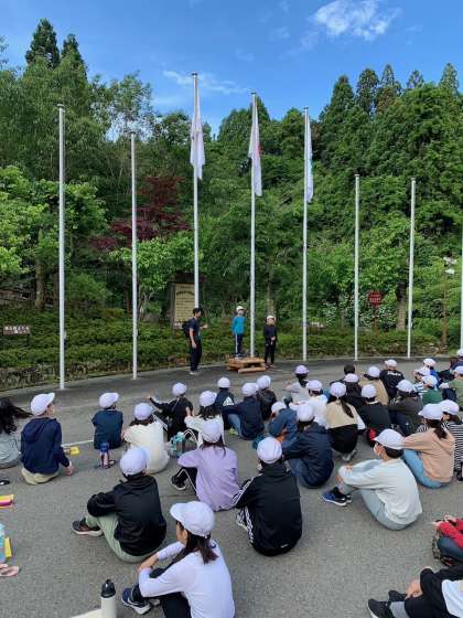 素晴らしい青空の下、2日目の花背山の家がスタートしました。朝の集いでは、今日の目標、「挑戦」について確認し、元気に朝のダンスをしました。