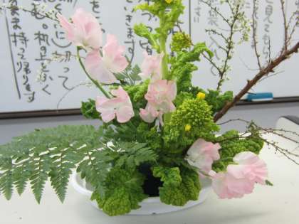 前回にもお世話になった辻井ミカ先生の説明を聞きいたり見本を見ながら,お花を生けていきます。みんな同じようにお花をいけているのですが,面白いことに同じものは一つもなく,それぞれに違ったいい味が出ていました。