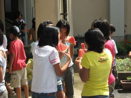 スイカ割りで見事に割れたスイカを,少年補導の皆様が切り分けてくださいました。児童はおいしくいただきました。