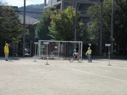 右京警察署の方と嵯峨交通安全推進会の皆さまにご協力いただき、交通ルールを守った自転車の運転の仕方を教わりました。子どもたちは緊張した様子を見せながらも、一生懸命取り組んでいました。安全のために気を付けるポイントがたくさんありました。今日学んだことをしっかりと生かして、これから自転車に乗っていってほしいです。