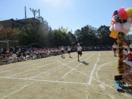 開会式と応援団のエール交換が終わったら、4年生の100m走です。昨年よりも距離が長くなり、走る前は緊張している様子も見られましたが、「よーいドン!」の合図で一生懸命、全力で走っていました。順位に関わらず、みんなとてもよく頑張りました!