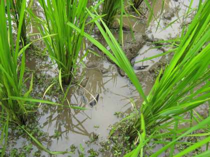 毎朝当番で来てくれる5年生に,田んぼも感謝しているのでしょうか。今日は児童のゴムぞうりをつかまえてしまいました。