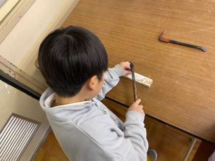 図画工作科の「くぎうちトントン」の学習をしています。今日は、金づちの打ち方、くぎの打ち方を学習して、実際にくぎを木にうったり、ぬいたりして体験しました。子どもたちはすぐに慣れて、上手にくぎを打っていました。