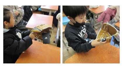 大谷選手からのグルーブが嵯峨小学校にも届きました。1年生もみんな実際に手にはめてみました。「野球をしてみたいと思ったよ。」「キャッチボールしたいな。」みんなとてもいい笑顔でした!