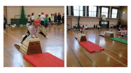 体育の学習ではとび箱にチャレンジしています。ジャンプの足や手をつく場所など、重要ポイントはたくさんです。くり返し練習し、どんどん上達しています!