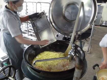 給食室では、にんじん・ベーコン・たまねぎを炒め、チキンスープを加えて煮たところに、スチームコンベクションで蒸したじゃがいもを加えて、塩とこしょうで味付けした時に、卵の除去食を取り分け、その後、卵をとき入れ、加熱して仕上げました。